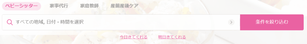 予約サイトにログインし、希望する日時・場所・依頼内容でシッターを探します。